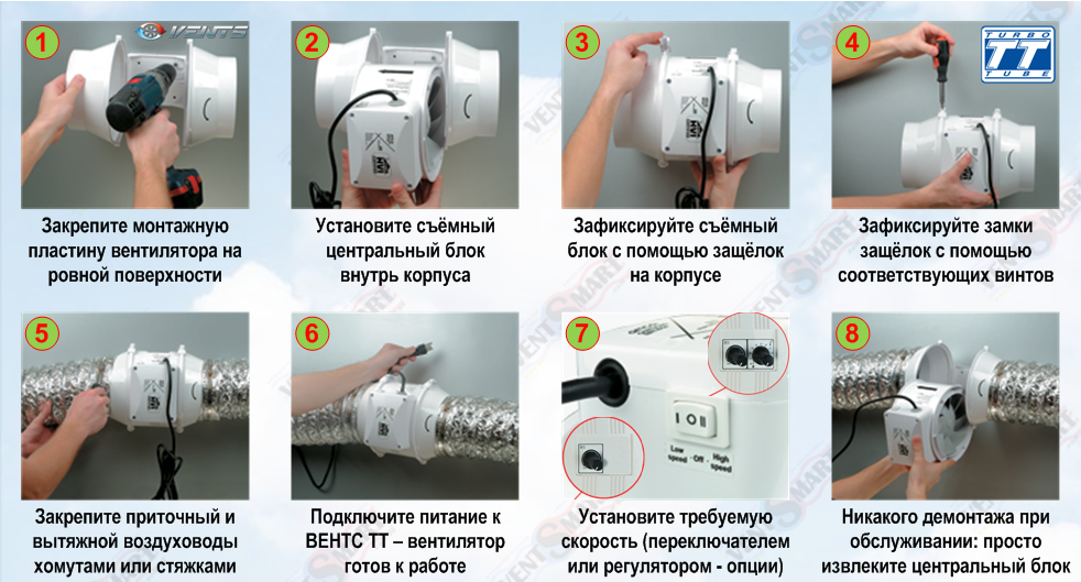 Сам вентилятор устанавливается после завершения работ. Процедура установки выглядит следующим образом: