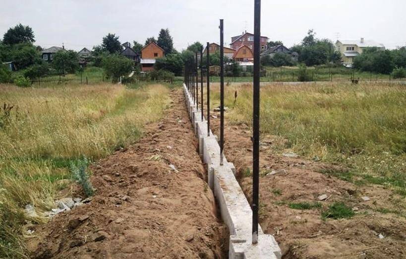 Ограждение на фундаменте обладает повышенной надежностью. Такой каркас способствует наибольшей ветроустойчивости. Ленточный фундамент заливается бетоном по всей протяженности ограждения, при этом используется арматура и опалубки. На финальном этапе выполняется облицовка фундамента кирпичом или камнем.