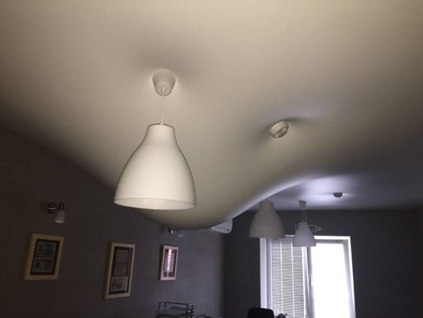 На месте, где была выпуклость с водой, полотно вытянулось и имеет не красивый вид. Чтобы это устранить пленку в этом месте прогревают феном до тех пор, пока она не натянется и примет первоначальный вид. После этого производят монтаж прибора освещения
