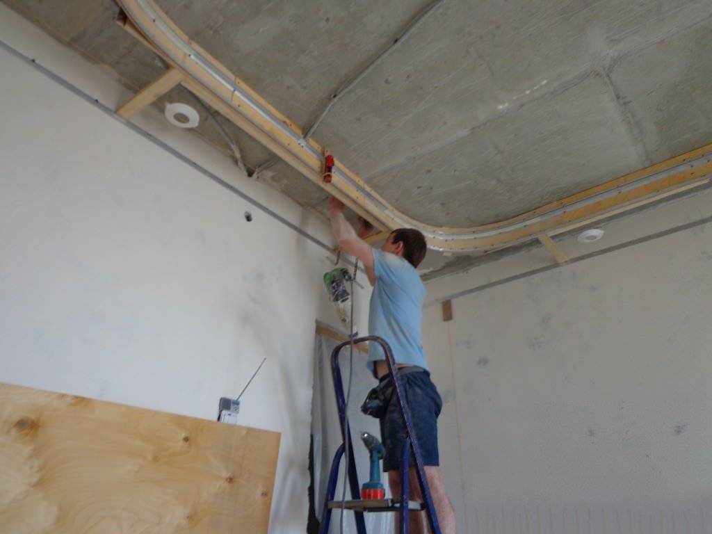 Монтаж потолочной конструкции обычно выполняют по завершении всех пыльных работ, на финальных этапах ремонта. Специалистов для замера вызывают перед тем, как наклеить обои. Натяжной потолок, за которым предполагается размещать другие устройства (например, светильники и коммуникацию), устанавливают, отступая от чернового потолочного покрытия минимум 5 см.