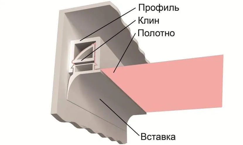 Натяжной потолок — это конструкция из специального полотнища, закреплённая под основным потолком. Для фиксации отделочного материала обычно используют алюминиевые либо пластиковые багеты, закрепляемые при помощи дюбелей по периметру комнаты. Зазоры между сопряжением полотна со стенами скрывают декоративной пластиковой накладкой из ПВХ.