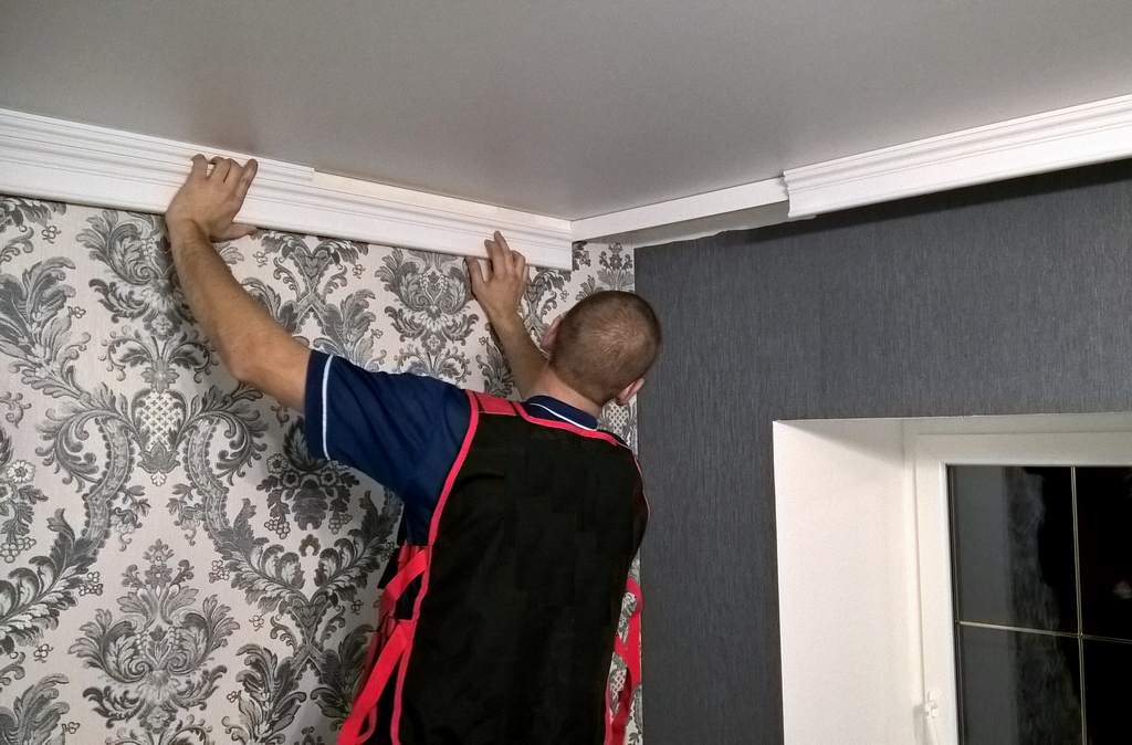 Когда всё высохнет, можно начинать оклейку. Детали процесса зависят от того, чем закрыта технологическая щель между полотном и стенами — декоративной вставкой или потолочным плинтусом.