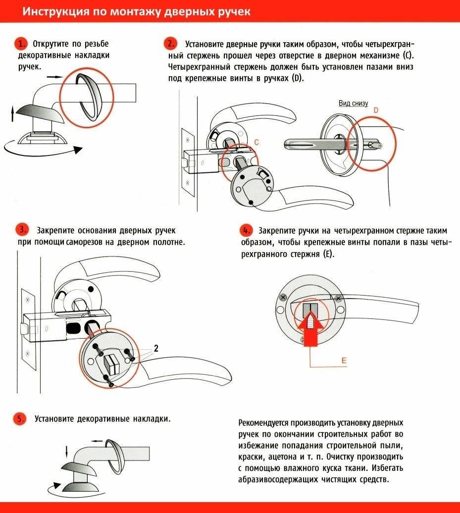 Механизм ручки прикручивается к дверям саморезами, но чтобы крепежная шайба не портила вид, она прикрывается декоративной накладкой, после чего устанавливается ручка.