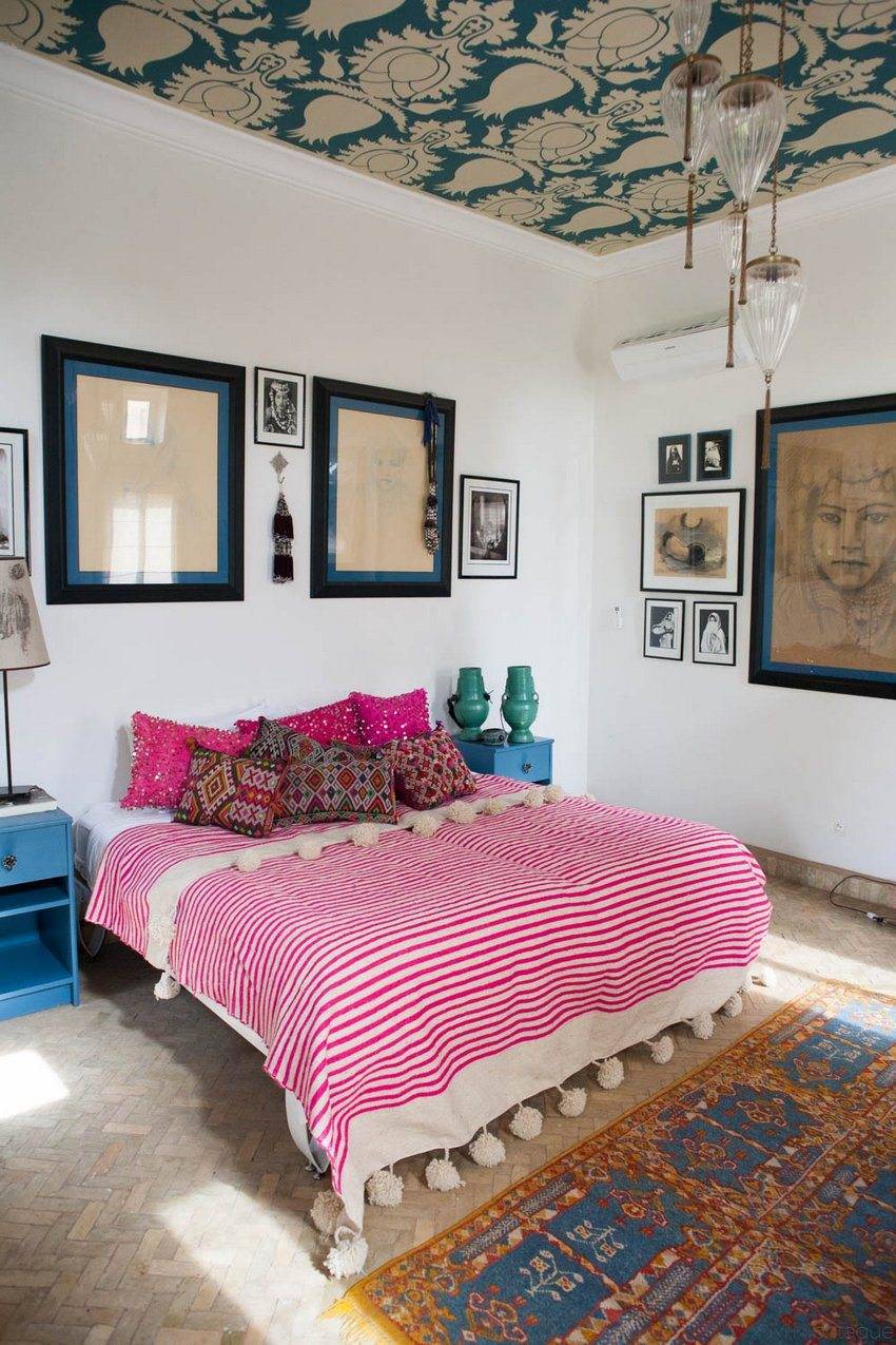 Пример эффектного оформления потолка с помощью ярких обоев и его сочетания с однотонными стенами