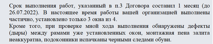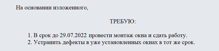 - мотивировочная часть с изложением мнения автора о том, почему он считает адресата претензии виновным в установке некачественного окна;