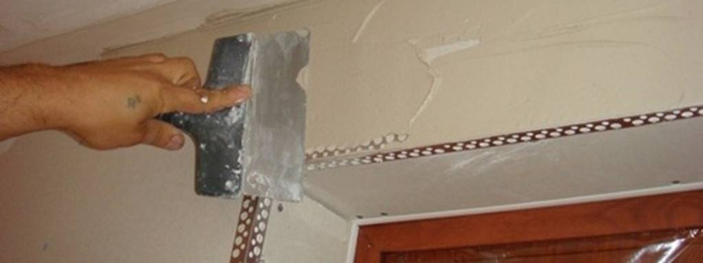 Предварительно по стыку с обоих сторон распределяют штукатурку. Сразу в нее аккуратно вдавливают профиль. Излишки смеси, которые вышли сквозь перфорацию, снимают шпателем. С помощью уровня проверяют вертикаль.
