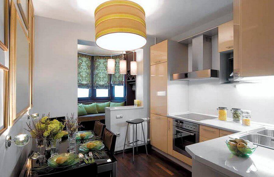 Присоединение лоджии к кухне кажется самым оптимальным вариантом, поскольку даже на маленькой конструкции с эркером можно оборудовать уютный обеденный уголок.
