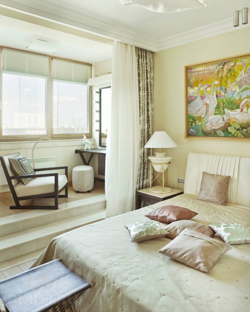 Если лоджию присоединить к небольшой спальне — это расширит помещение. Сделать это намного проще, чем объединять между собой другие помещения.Спальную зону при необходимости можно изолировать шторой, или перегородкой, легким декоративным панно .