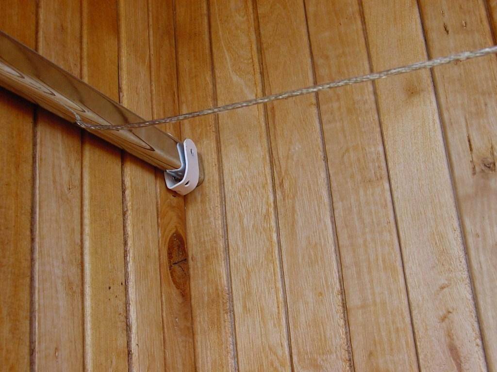 Рассмотрим, как выполнить самую простую модель, которая способна выдержать большое количество мокрого белья. Данная конструкция подходит для балконов с двумя противоположными стенами. На одну из них необходимо установить небольшую деревянную рейку, а на другую крепится растяжка. На одинаковом расстоянии друг от друга на обеих сторонах монтируют саморезы в форме колец. Именно через эти кольца протягивают бечевку или другой материал, подходящий для сушки белья.