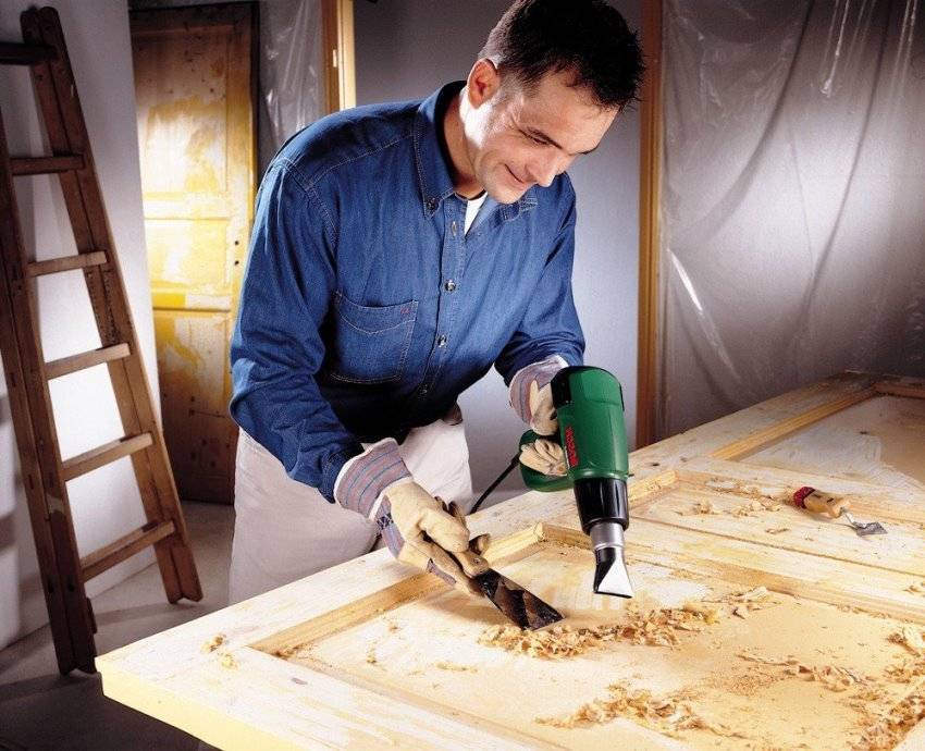 Дверь необходимо снять с петель, уложить горизонтально, предварительно открутив фурнитуру, и с помощью строительного фена (если слой толстый) или шлифовки удалить старое покрытие. Нужно внимательно осмотреть полотно, чтобы не осталось следов старого лака, краски или неотшлифованных мест.