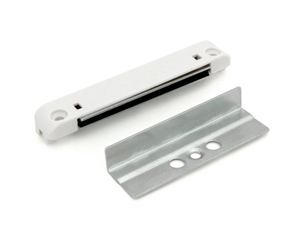 Магнитные защелки включают две основные детали:магнит, который устанавливается на корпус двери (коробе); он «спрятан» в пластиковый корпус, который прикручивается саморезами; а также пластины из металла (стали), которая притягивается к магниту и за счет этого удерживает полотно. Такая пластинка фиксируется на створке.