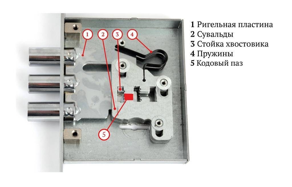 В сувальдном замке находятся стальные пластины, которые сдвигаются с помощью выступов на ключе. Такие запирающие механизмы более надежные, чем цилиндровые.