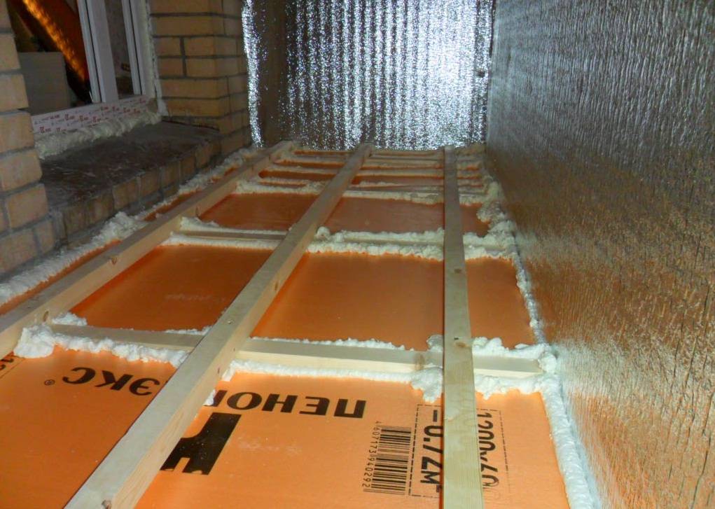 Теплый балкон не может существовать без утепления пола. Дело в том, что большая часть тепла теряется именно через него, приводя к нежелательным последствиям. Чтобы утеплить пол своими руками, необходимо сделать следующее: