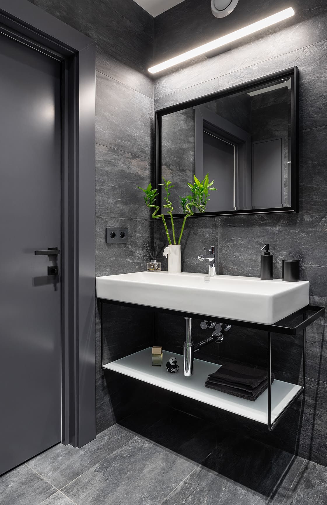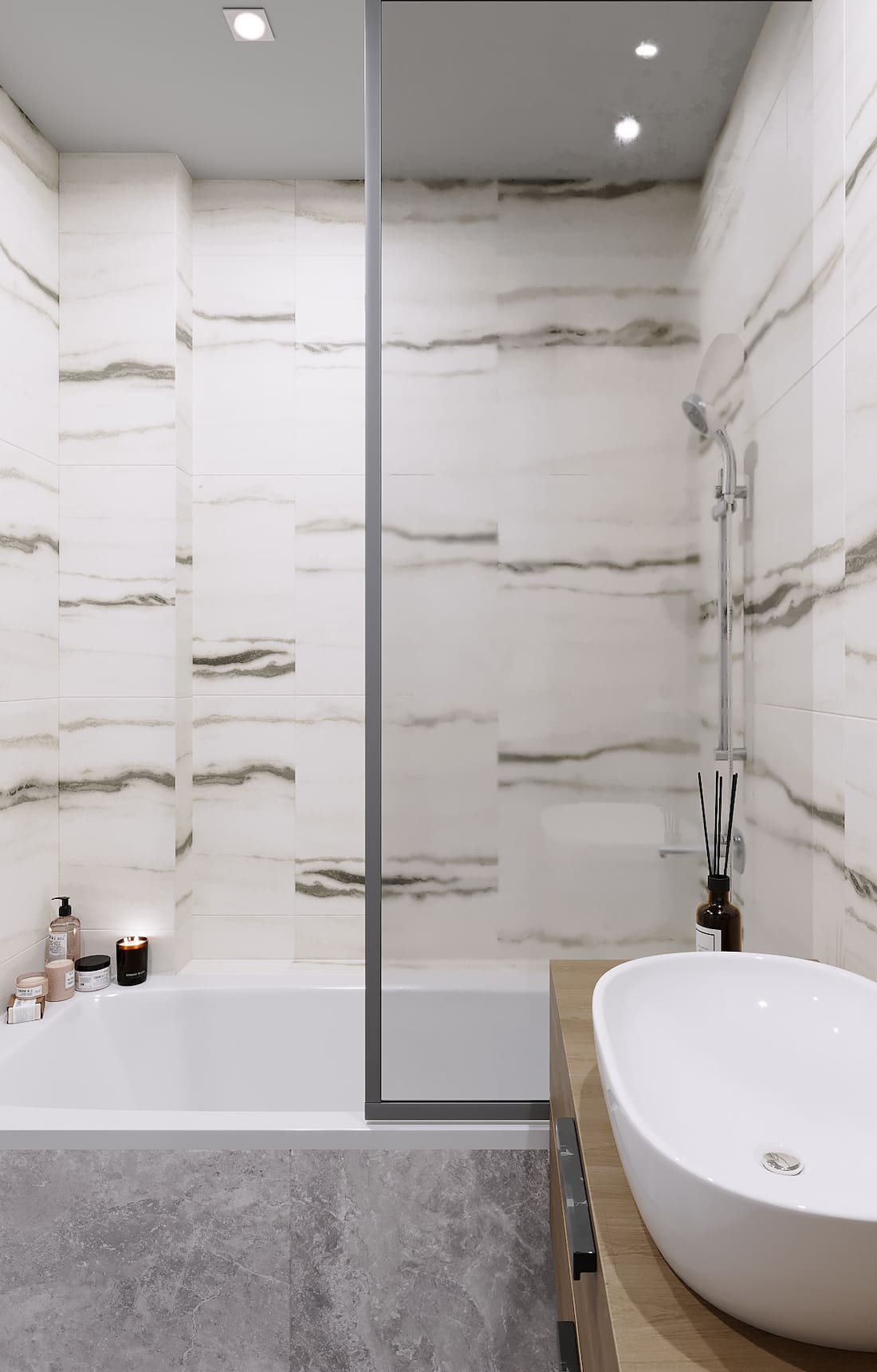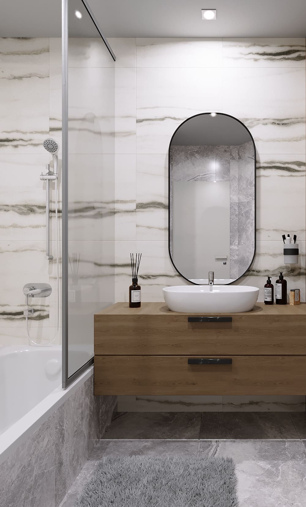 Модной тенденцией на 2022 год будет однотонная и нейтральная поверхность. Но игра с контрастами также допустима. При чем комбинировать можно не только оттенки, но и фактуру материала. Благодаря такому приему можно зонировать пространство, красиво подчеркнув дорогостоящую ванную либо умывальник.