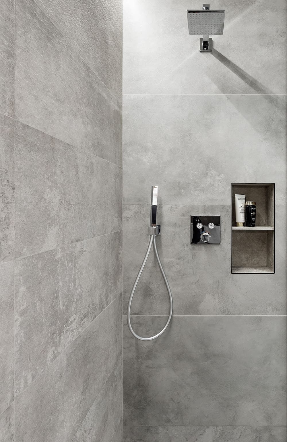 Крупная плитка прямоугольной формы размером 30х60 см и выше больше подходит для просторных помещений, поскольку способна визуально уменьшать пространство. Она просто идеальный вариант для узких и длинных ванных комнат: чем меньше условных линий будут разделять стены комнаты, тем больше она будет казаться. Чтобы зрительно расширить пространство, выкладывать такую плитку лучше поперек. Для отделки просторных помещений отлично подходит и крупная плитка квадратной формы размером 45х45 см и выше.