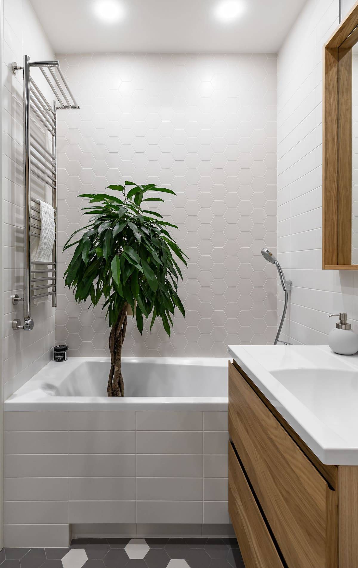 Оптимальный вариант размера плитки для маленькой ванной – элементы средних размеров в пределах 20х30 см. Они не будут «рябить» в глазах, создавая ощущение давление, а, напротив, зрительно раздвинут пространство. Имея дело с низкими потолками, выбирайте плитку прямоугольной формы, укладывая элементы на стене вертикально. Такой прием позволит визуально приподнять своды потолка, вытянув помещение.