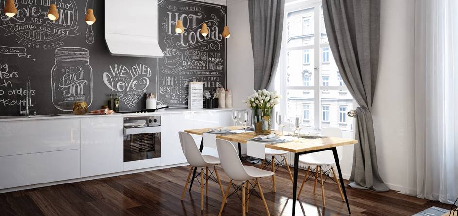 Матовое покрытие грифельной краской может стать акцентом вашего дизайна. Не бойтесь реализовывать свои творческие идеи!