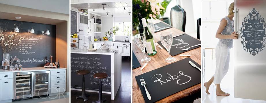 Красить грифельной краской можно не только стены, но и всевозможные предметы интерьера: дверцы старого холодильника, кухонных шкафов, выдвижные ящики комода, столешницы, вазоны, чашки, банки, коробки для хранения мелочей и многие другие вещи. Для рисования лучше использовать мягкие мелки без инородных включений, которые могут поцарапать материал.