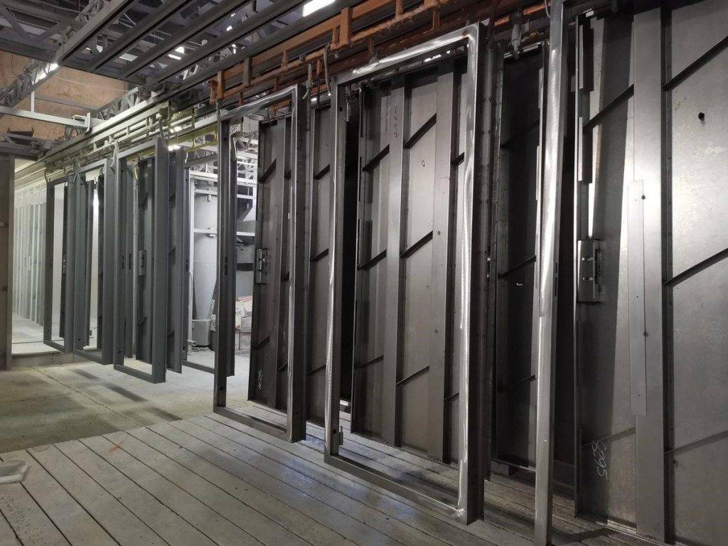 Высота всех дверных конструкций одинаковая и составляет 2000 мм, что отлично сочетается с типовым проёмом в стене 2100 мм от высоты чистого пола или 2200 мм от плиты перекрытия. При необходимости изготовления более высокого полотна двери, в проём вваривается несущая рама, которая закрывается стальными листами – глухой фрамугой.