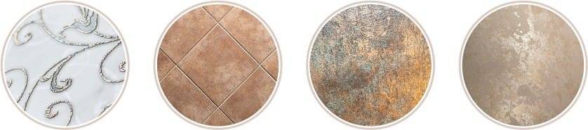 Керамогранит также предлагает виды с совмещенными характеристиками (глянец+матовые): лаппатированные, сатинированные, структурированные (имитации природных рельефов), «под металл».