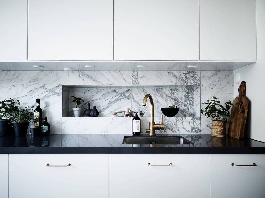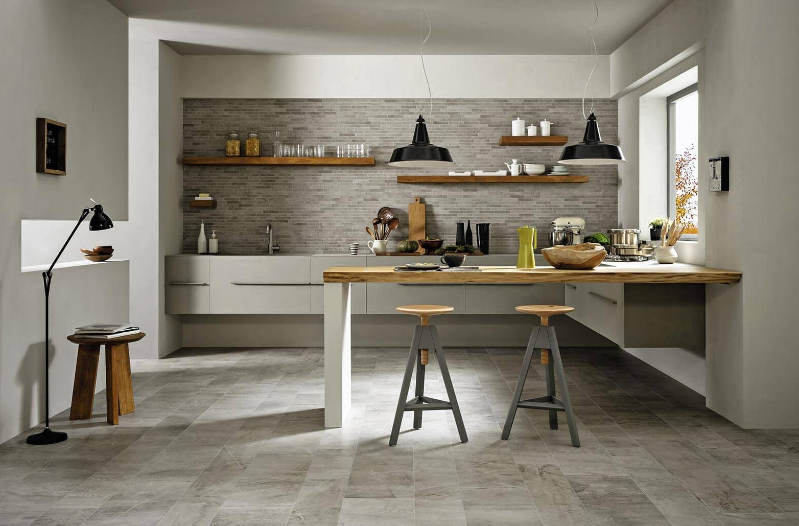 В дополнение к керамической плитке все чаще выбираются плитки из натурального камня, массы, напоминающей натуральный бетон, кирпич или металл. Материал дает очень оригинальный эффект, и в то же время достаточно практичен. Металлочерепица является хорошей альтернативой листовому металлу, потому что она выглядит более декоративно, ее легко укладывать. Результат подходит как для современных, так и для промышленных кухонь, сочетая красивый вид с современными тенденциями.
