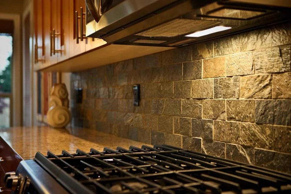 Изделия из натурального камня или его имитации хорошо сочетаются с природными и этническими интерьерами. Вы можете получить их как в виде плит и панелей, так и интересной каменной мозаики. Хотя мраморные плиты не требуют большой пропитки, модели из травертина или других пористых материалов должны быть тщательно пропитаны (желательно до затирки), потому что в кухонных условиях они подвергаются разрушению. Однако, несмотря на это, охотно выбираются на фартук, потому что выглядят действительно эффектно и подходят ко многим стилям.