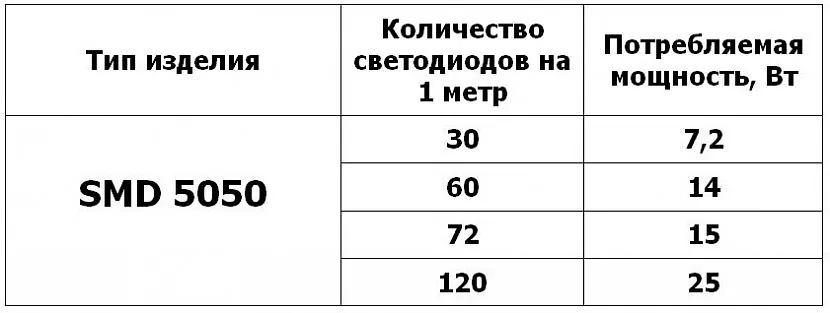 Таблица – мощность светодиодных лент 3528 и 5050: