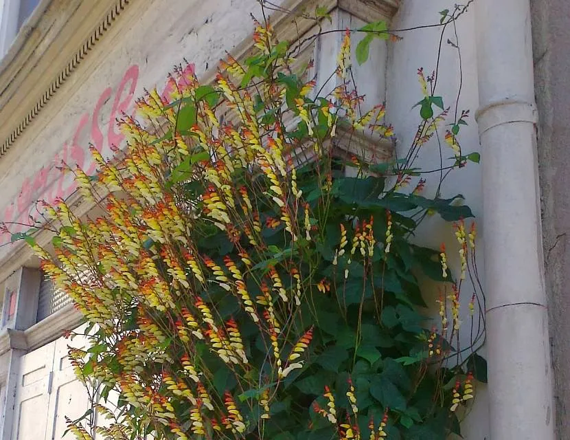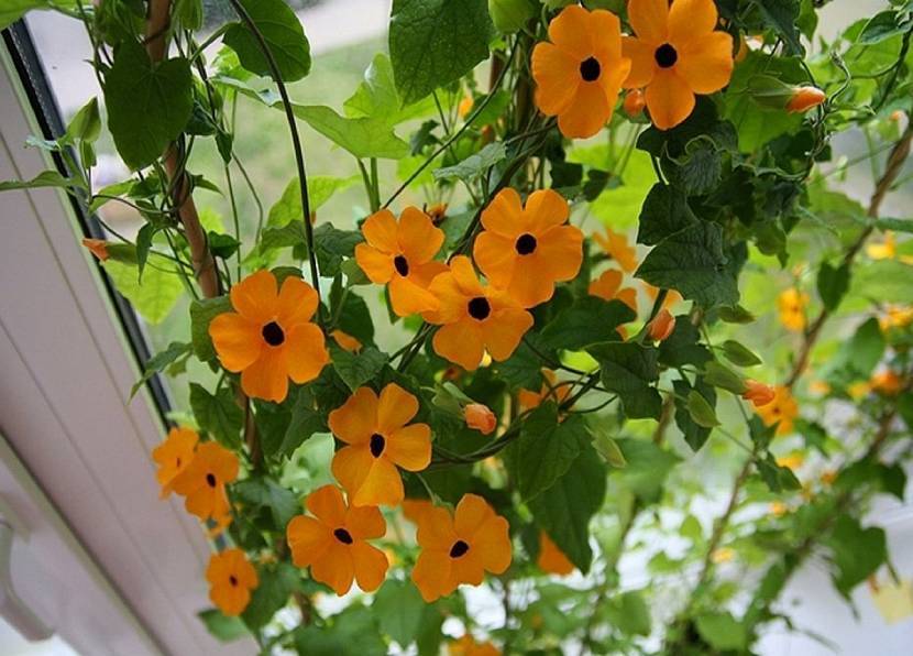 Тунбергия — однолетняя лиана 1,5 – 2 метра длиной с ярко желтыми, белыми или оранжевыми цветками до 5 сантиметров в диаметре с темной сердцевиной.