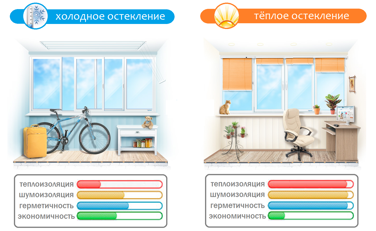 Есть два типа остекление — холодное и теплое. При холодном типе температурный режим на улице и в помещении отличаются на 5-6 градусов. Потому следует учесть до каких пределов способна опуститься температура за типичную зиму в регионе проживания.