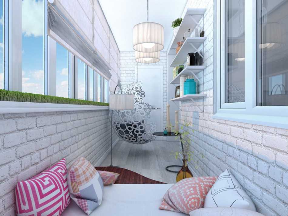Собираясь устроить на балконе уголок для отдыха, выбирайте материал приятный на ощупь, экологичный, но в то же время стойкий к истиранию и ультрафиолетовым лучам. Если под покрытием не планируется теплый пол, не стоит укладывать плитку или делать наливной пол – такая поверхность будет очень холодной. Лучше использовать ламинат, любые деревянные покрытия, линолеум на толстой подложке.