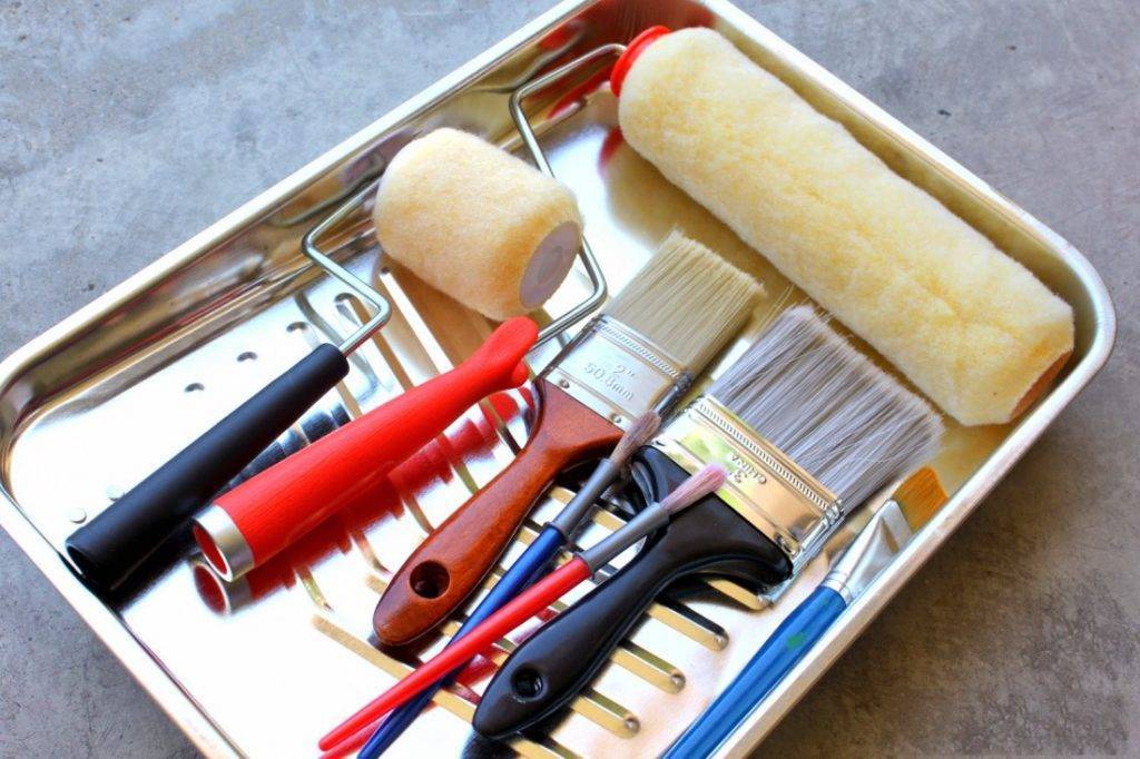 Для окрашивания поверхности вам не обойтись без кисточки и валика. Если выбранный краситель достаточно жидкой консистенции, можно использовать краскораспылитель – с ним работа пойдет быстрее. В качестве дополнительных и не менее важных средств нужно подготовить малярную ванночку, перчатки, ненужную тряпку, малярный скотч.