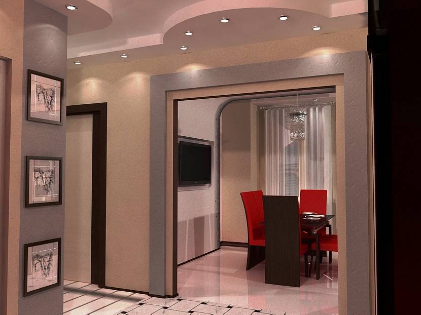 - При низких потолках вряд ли стоит избавляться от межкомнатных дверей. По крайней мере, следует хорошо подумать. Единственно возможный вариант отделки проема после их демонтажа – оштукатуривание с последующей оклейкой (обоями, тканью) в тон стенам. Соорудить арку этим способом достаточно просто; необходимо лишь грамотно обработать торцевые части прохода. Но данный вариант дизайна помещения имеет существенный минус, а потому устраивает не всех – отсутствие обрешетки делает невозможным установку в проеме скрытых точечных светильников.