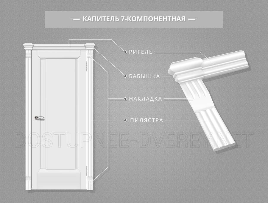 Попробуйте угадать, о каких 3 и 7 компонентах идет речь? Сколько бы вы не думали, вряд ли угадаете. А все потому, что пилястры не относятся к числу компонентов, которые входят в общее количество. Да, их изготавливают, их добавляют в заказ и устанавливают рядом с дверью. Вам не придется искать планки обналички в одном стиле с капителями. Однако, факт, озвученный выше, от этого не меняется.