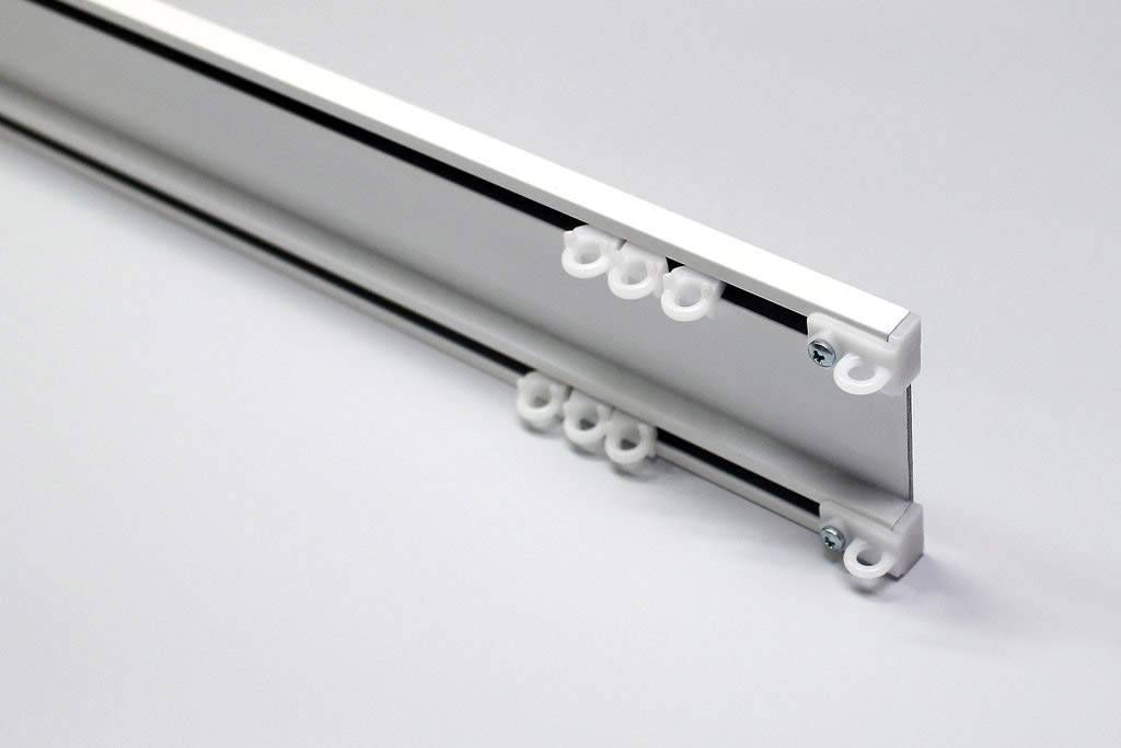 - профильная – направляющая конструкция с 1/2/3 канавками, внутри которых держатели штор, скрытый тип монтажа, алюминиевый профиль с хорошей грузоподъемностью либо пластиковый для легких тканей;
