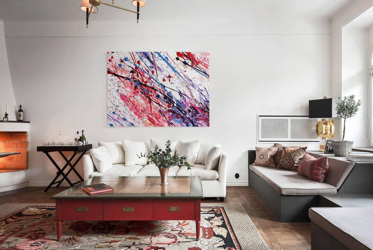В публичной комнате вся обстановка должна выстраиваться таким образом, чтобы ни один элемент в том числе и картины не выбивались из стилистической концепции. Это первое и самое главное правило. Соблюдая его при выборе картин, велик шанс купить именно то, что заиграет в гостиной.