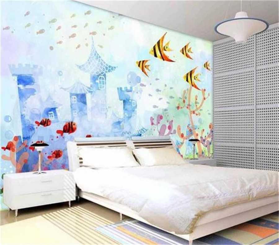 Детские 3д фотообои можно разместить и на потолочной поверхности, как показано на фото, где комната, словно погружена в глубины океана. Хорошим выбором оформления потолка, особенно, для детей, которые боятся темноты, станут стереоскопические Зд фотообои, создающие мягкую успокаивающую подсветку.