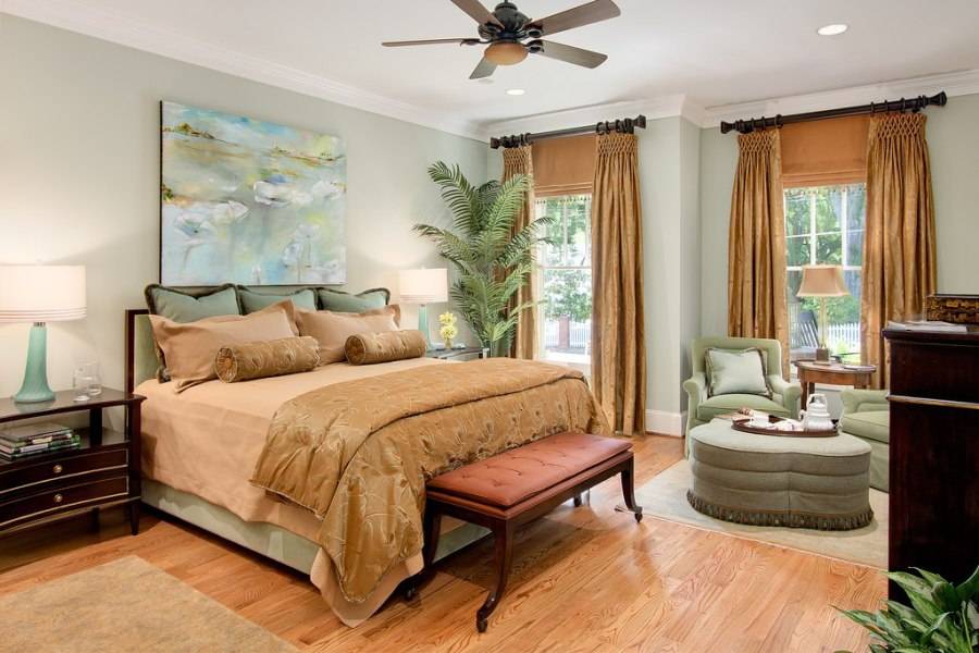 Здесь важно соблюдать гармонию не только между цветом и стилем, но и между фактурой материалов. Например, для нежной спальни прекрасно подойдут акварели, а для комнаты с деревянными панелями живописная морская тематика