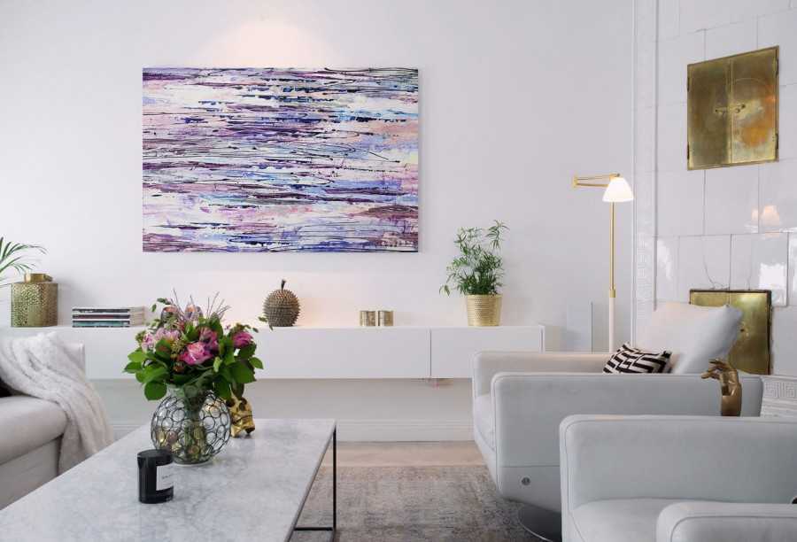 Первое, о чем всегда следует помнить – это вопрос сочетаемости. Причем, сочетаемость должна быть не только по цвету, но и по смыслу. Например, если вы планируете обустроить современный интерьер в геометрических пропорциях, добавлять к нему картину с изображением цветов будет совершенно неуместным решением. Даже в том случае, если оттенок растений идеально сочетается с цветом мебели. Более правильно будет повесить на стену картину с абстрактным мотивом.