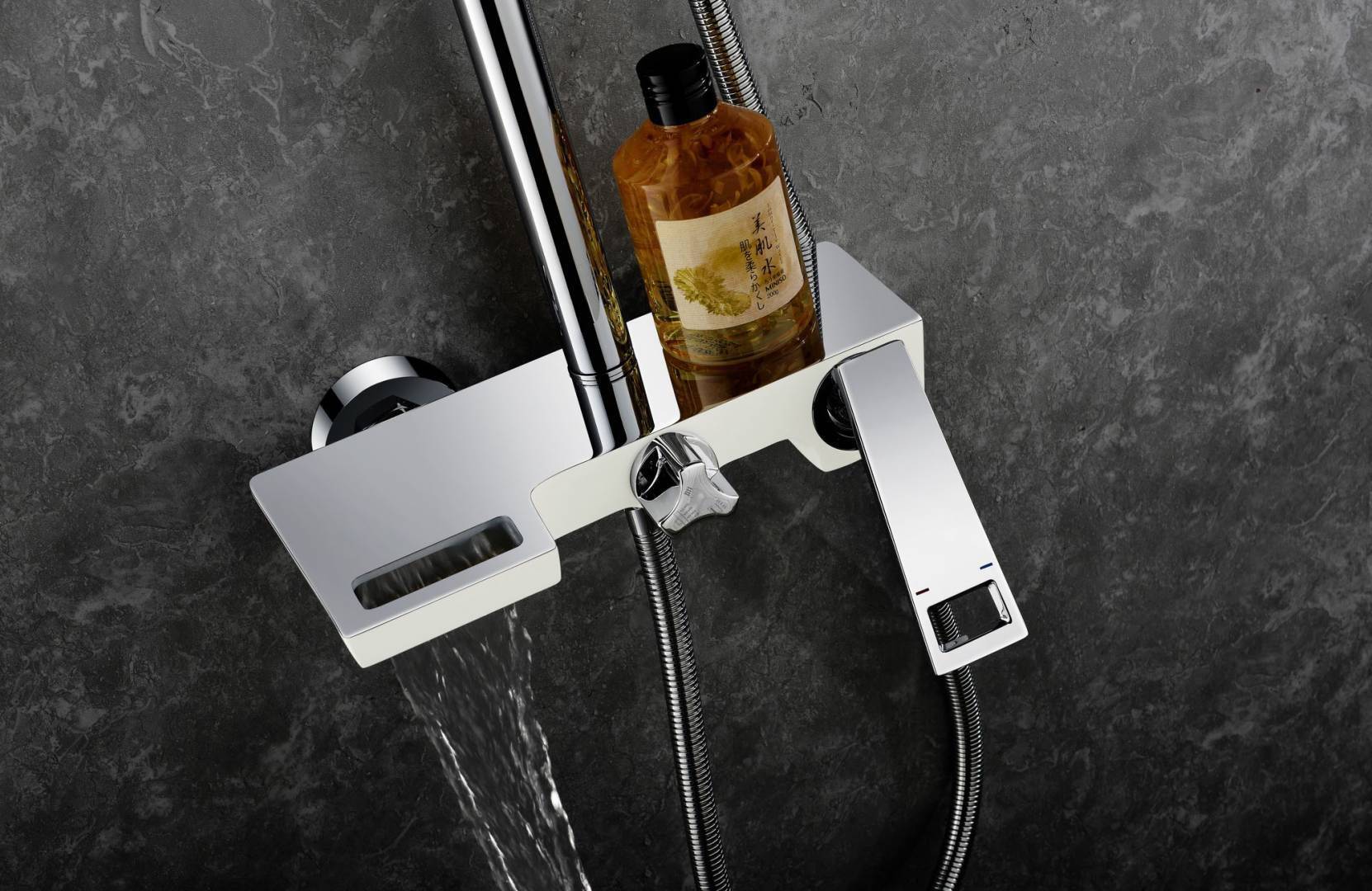 Конструкция предусматривает скрытый шланг для душа. Что, с одной стороны, является плюсом, позволяя спрятать не очень эстетичную деталь, но с другой подвергает гибкую трубку постоянной деформации, снижая срок ее службы. Водопадные смесители могут быть укомплектованы двумя вентилями – для холодной и горячей воды. Или быть однорычажными, когда все управление производится поворотом единственного поворотного рычага.