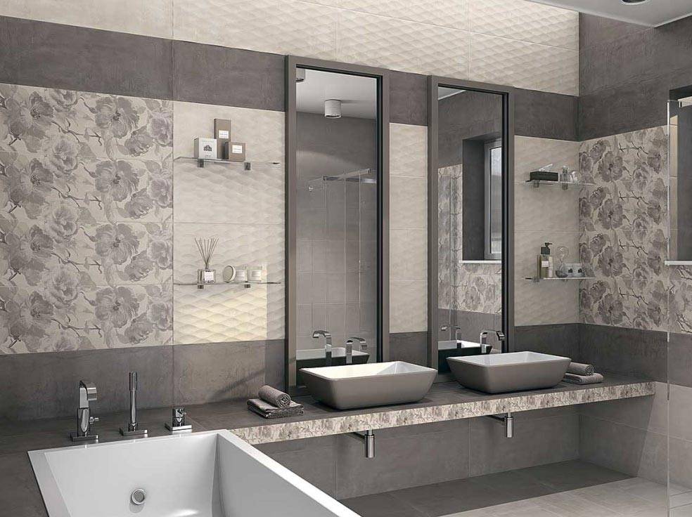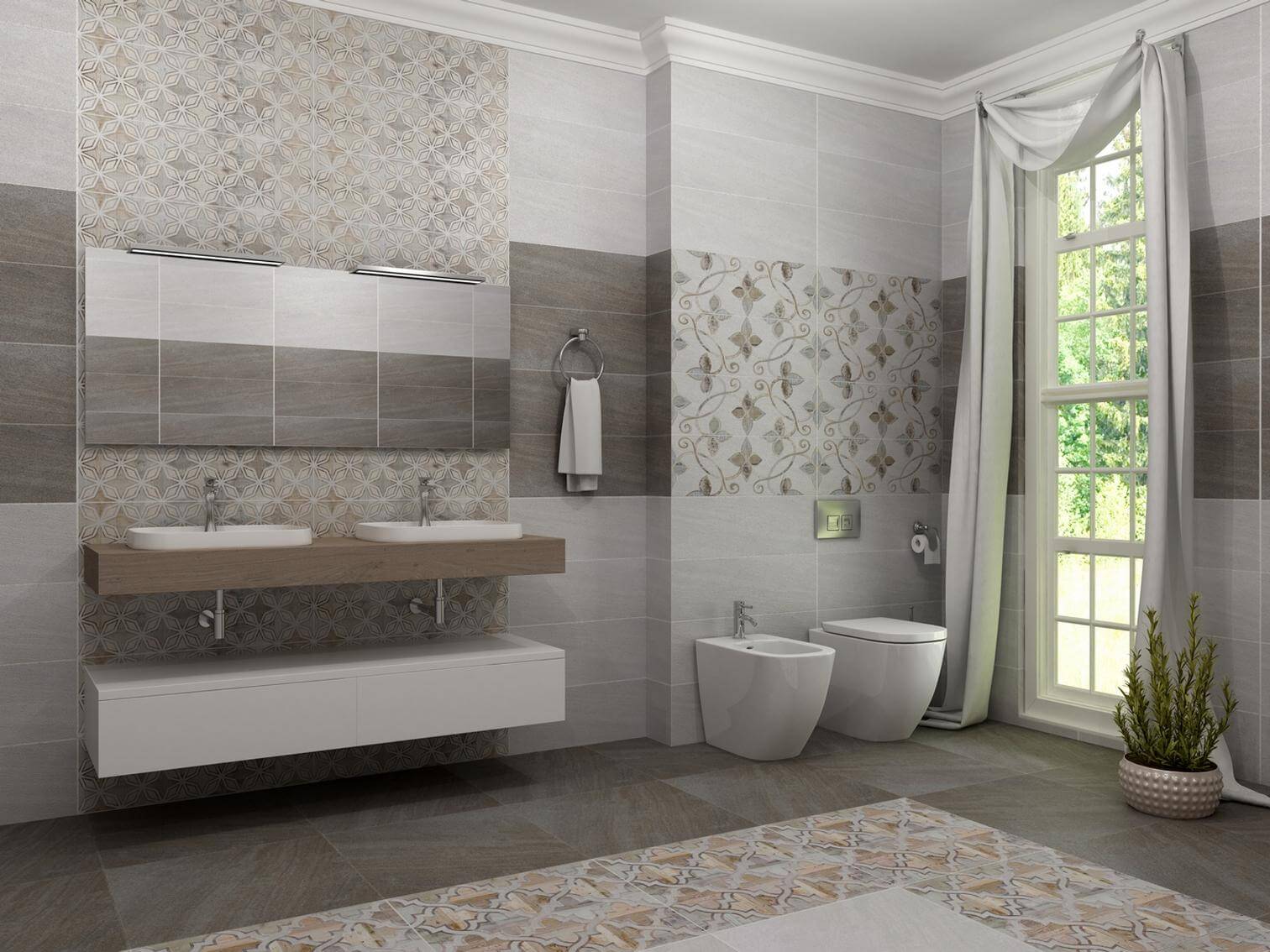 Сдержанная естественная гамма: серый, варианты бежевого. Вставки и бордюры с необычным геометрическим узором.