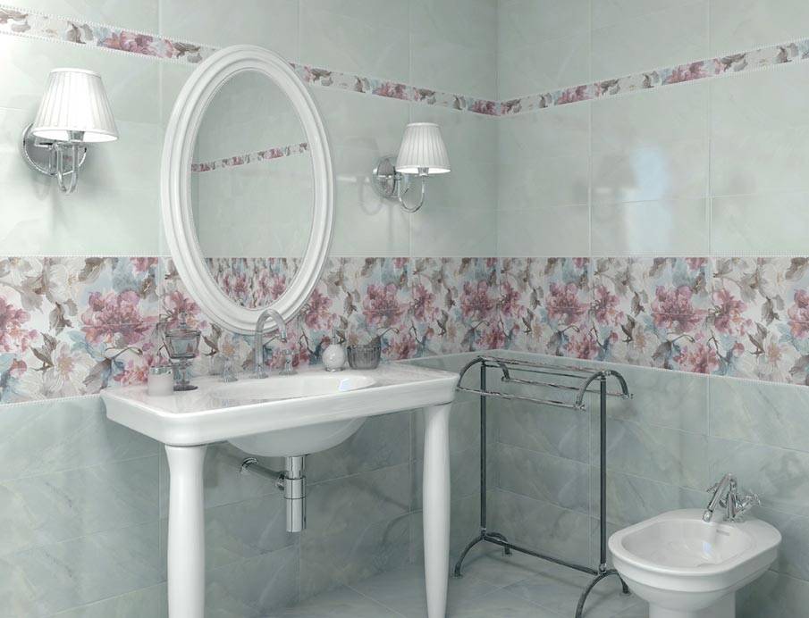 Коллекция французский стиль – легкий, изящный дизайн ванной, плитка высокого качества, нежный декор. Серия «Гран Пале» – плитка в дворцово-роскошном стиле, а также плюс подбор бордюров или мозаичных имитаций.