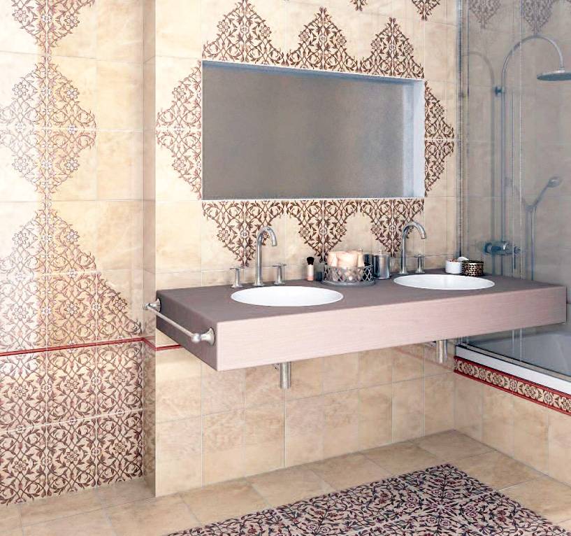 Скромное и сдержанное цветовое решение – нежный бежевый и коричневый . Стены украшаются декором, тонко прорисованными цветочными букетами, такие же цветочные мотивы на бордюрах. Изящно и ненавязчиво.