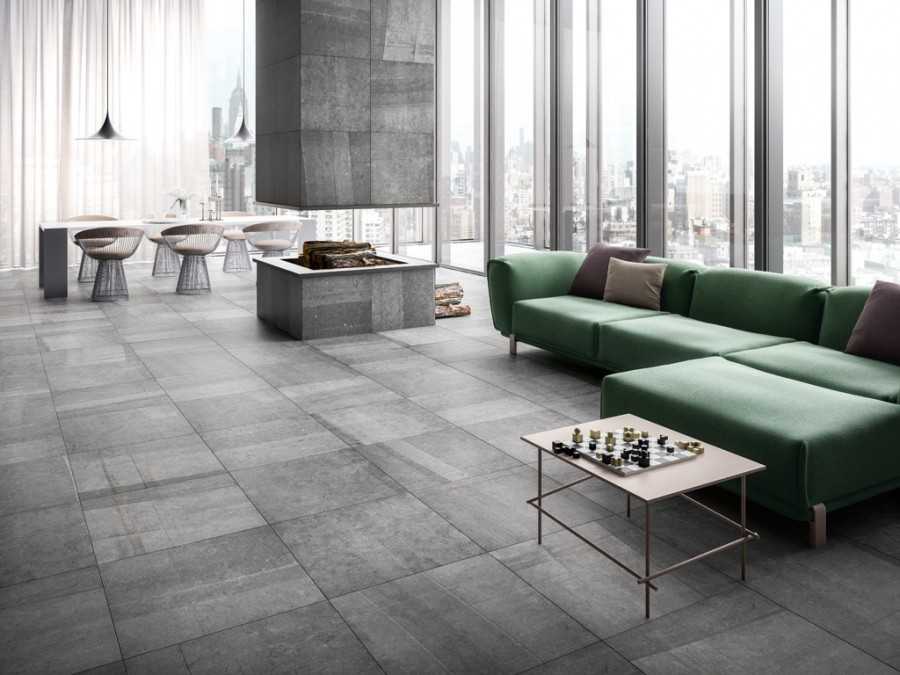 Можно выстелить пол и сатинированным керамогранитом, его приятный блеск придаст комнате особый шик. Для создания стиля «лофт» подойдут широкие плиты греса цвета «светло-серый моноколор», «темно-серый соль перец», «поликолор амба графит» и др.