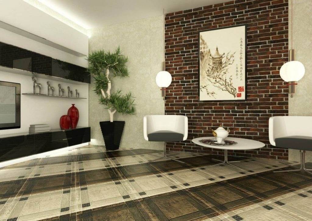 Использование напольной плитки в интерьере гостиной сегодня подчиняется нескольким приемам дизайна. Простое однотонное покрытие без рисунка или с простым принтом является скучным. Поскольку гостиная сама по себе – особенная комната жилища, то и атмосфера в ней должна быть соответствующей. Учитывая тот факт, что данное помещение является зоной с большой проходимостью, использование плитки является удачным и практичным решением. Современные производители идут в ногу с модными тенденциями: они разрабатывают материалы-компаньоны. В серии входят фрагменты с одинаковым фоном и разным рисунком: например, для облицовки можно купить однотонную плитку и точно с таким же фоном, но уже с рисунком. Из плитки можно выполнять рисунки разной сложности.