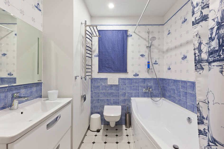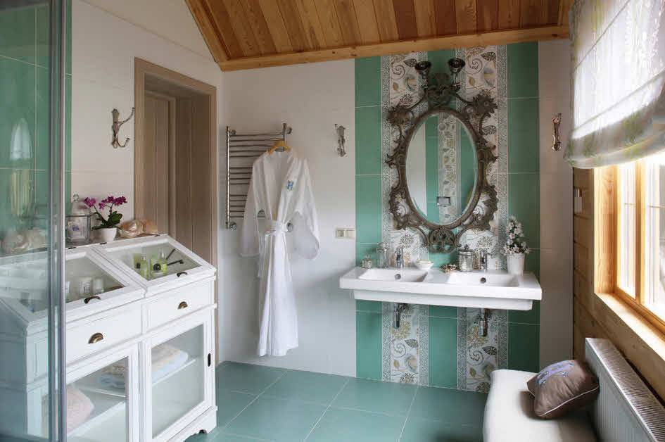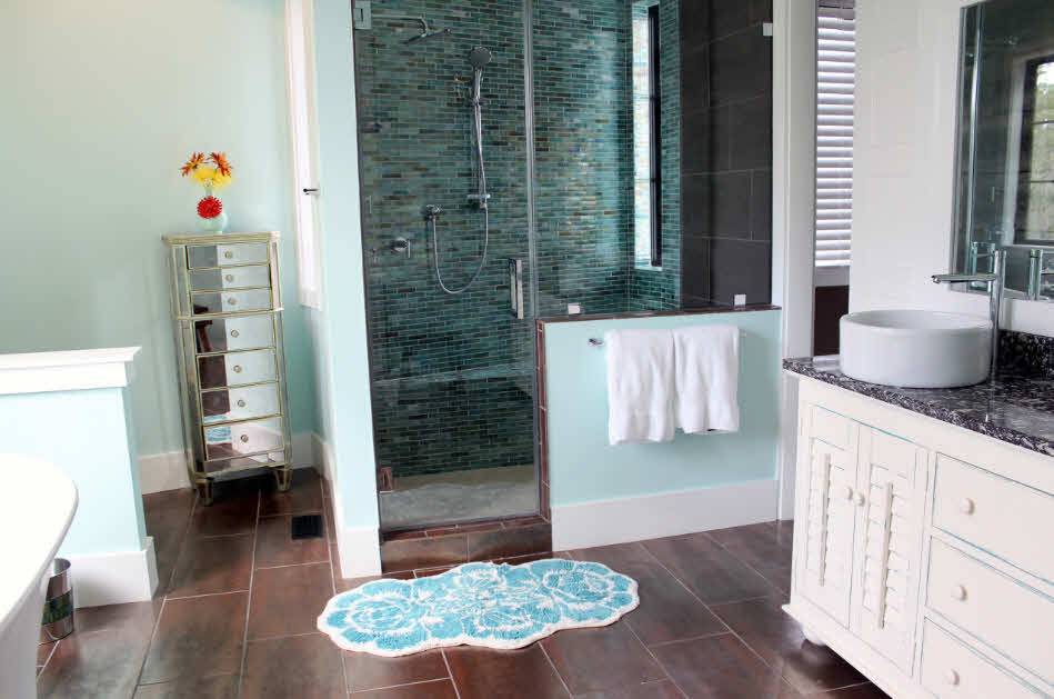 Однако нужно учитывать, что белый цвет может вызвать чувство холода и отсутствия уюта, именно поэтому следует уделить особое внимание акцентным стенам. Помимо этого, однотонную плитку следует довольно часто убирать (мыть, протирать) так как на ней видны даже самые незначительные грязевые, мыльные пятна или потеки.Голубые и зеленые тона