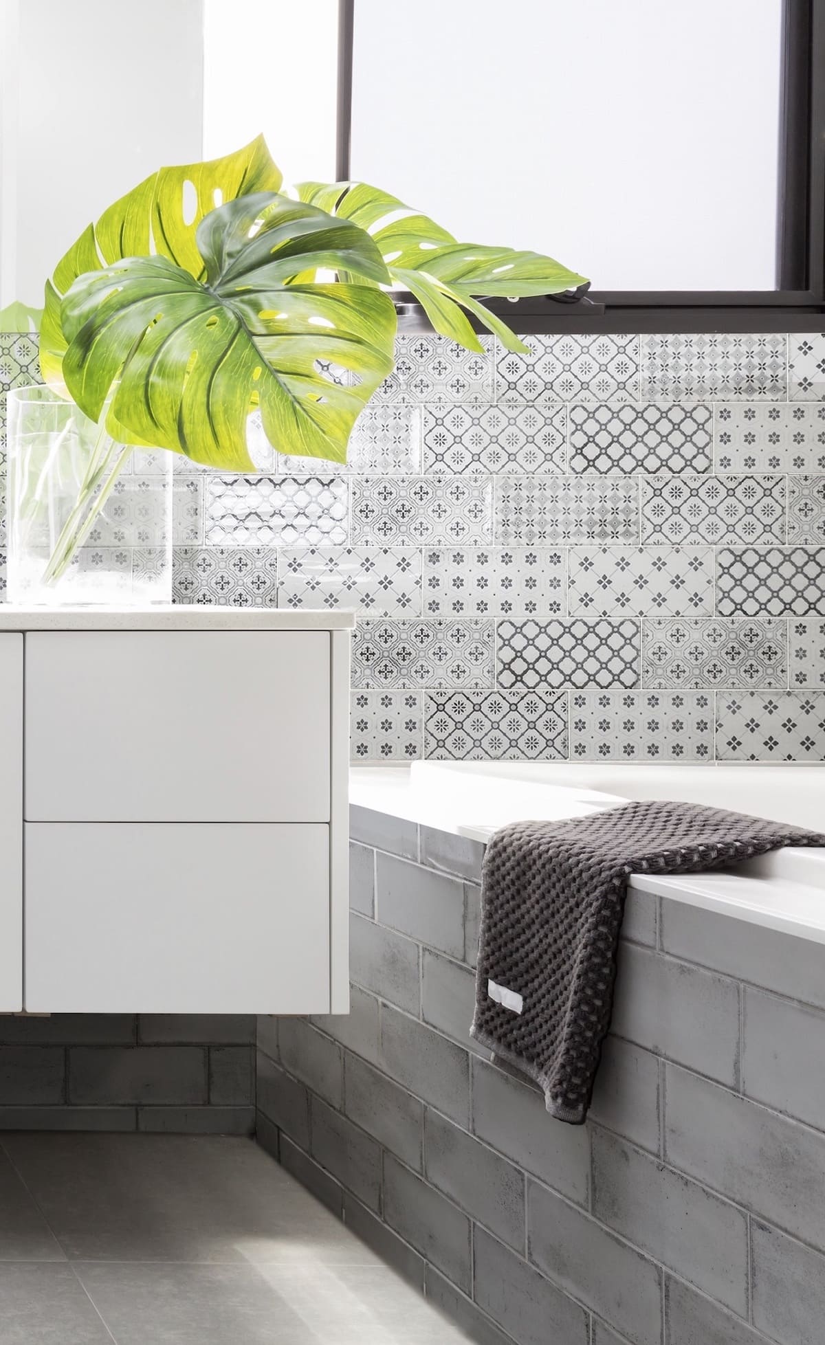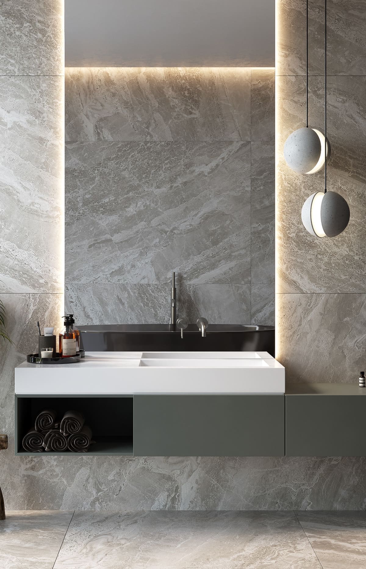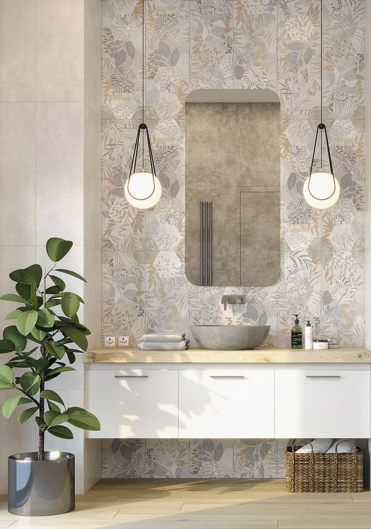 Для интерьера с современным, минималистским характером идеально подходит плитка, имитирующая необработанный бетон. Однако это не исключает художественно включенного декора стен — он не нарушает гармонию, но придает интерьеру уютный характер.
