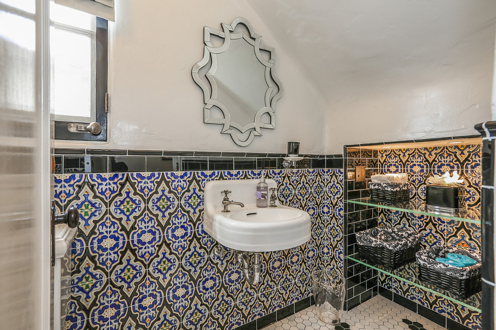 Ванная комната в стиле фьюжн с интересной керамической плиткой на стене