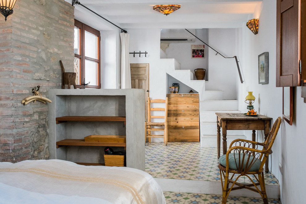 Декоративные ниши в стенах заполняют металлическими тарелками на подставках, изящными шкатулками, подсвечниками на массивных ножках, вазами с цветочным рисунком, глиняными кувшинами и чашами. Высокие окна украшают черными металлическими решетками.