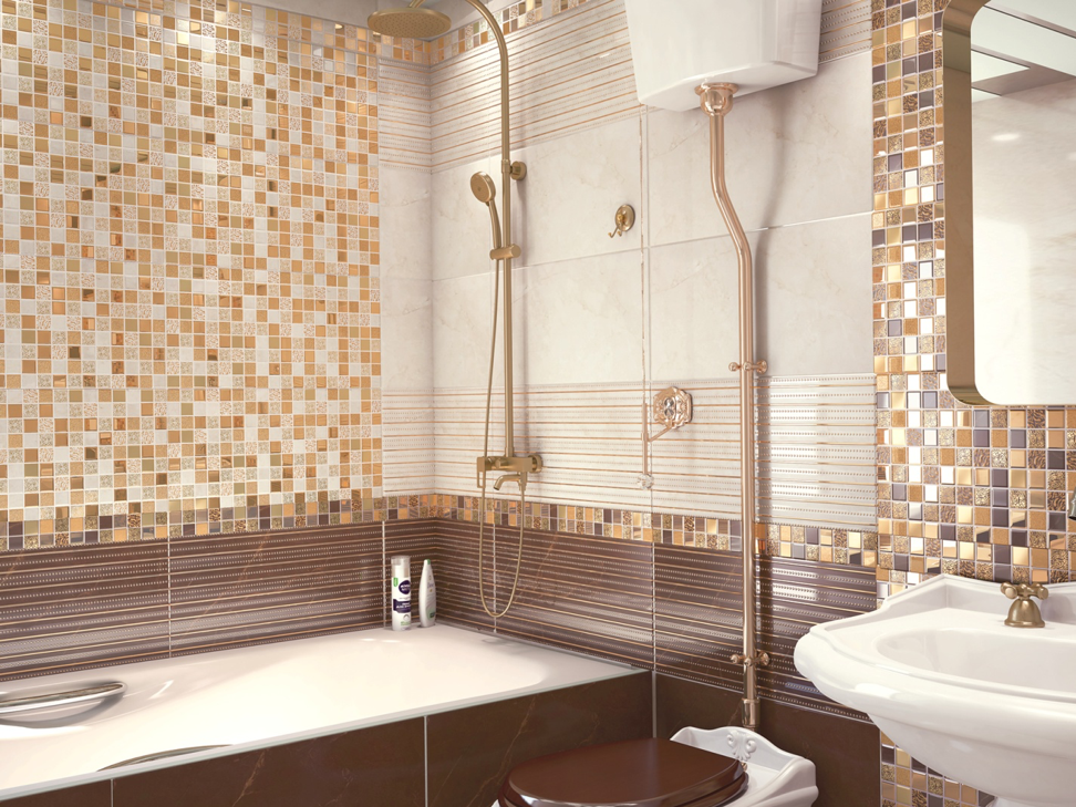 - Мозаику не стоит использовать на полу – она больше подойдет для отделки стен. Лучше выбирать квадратные и прямоугольные варианты плит. Отлично будет смотреться восьмиугольная плитка с броскими золотыми или серебряными вставками.