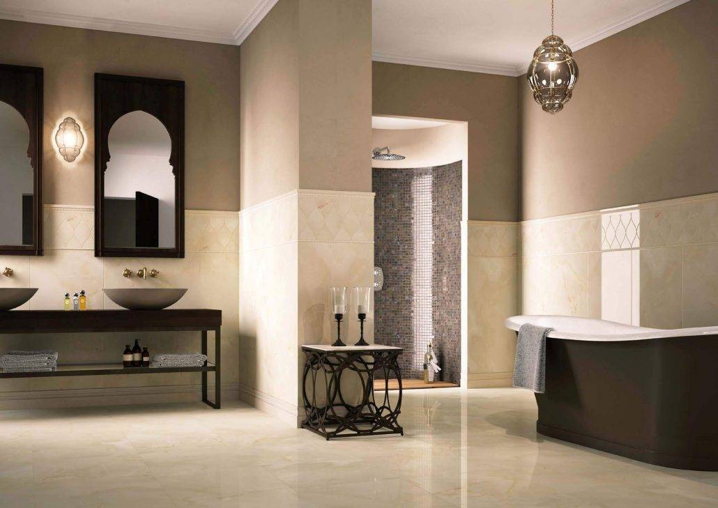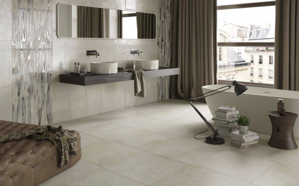 Размер крупной плитки составляет 25 х 40 см, как правило, ей оформляют пол. При облицовке крупной плиткой стен ванных комнат для достижения декоративного эффекта целесообразно использование композиции из плиток большого и среднего размеров.